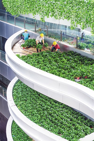 位于海南??诮瓥|新區(qū)起步區(qū)的海南能源交易中心大廈是集智慧、科技、低碳、高效為一體的“智慧辦公場所”,為用戶提供舒適的辦公環(huán)境。圖為大廈施工人員對樓內(nèi)綠植進行更換。孫士杰攝(人民視覺)