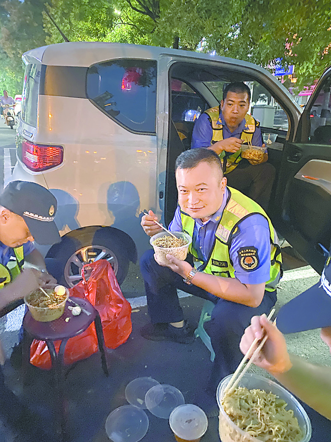 圖③ 山陽區(qū)城管局執(zhí)法一大隊三中隊孫玉新(中)吃著加班餐,疲憊的臉上依然擋不住對工作的熱愛。