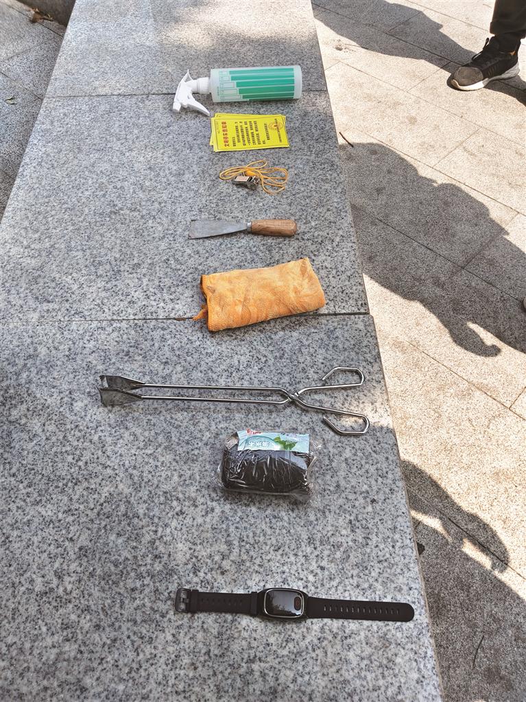 “非機(jī)動車停車區(qū)的車輛亂停,請來整理。”“廣場上有一塊油污,趕緊把洗掃機(jī)開過來清理?!薄肮徽九_上的座椅上有灰塵,來擦拭下?!薄浾攥F(xiàn)場看到,新吳“城市管家”除了統(tǒng)一著裝和隨身攜帶一部對講機(jī)外,還統(tǒng)一配備了智能手環(huán)、噴水壺、鏟子、夾子、干濕抹布、口哨、文明停車告知單等作業(yè)“八件套”(如圖)。江溪街道“城市管家”郭師傅邊展示他的裝備邊介紹:“這些都是我們?nèi)粘9ぷ髦械挠H密‘伙伴’,能讓我的工作更高效。比如智能手環(huán),不僅能記錄我日常的工作軌跡,還能監(jiān)測心率、血壓、血氧等身體數(shù)據(jù)。如果在工作中出現(xiàn)身體不適,手環(huán)會及時提醒我休息。鏟子、噴水壺、抹布等工具小巧便捷,分類放到定制的腰包里,隨身攜帶,拿取方便?!?/p>