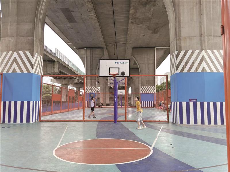 “高架樂園”不僅配備了嶄新的籃球場、棋牌廣場、文化舞臺、滑板場、乒乓球場、健身步道等文體設(shè)施,還在環(huán)境裝飾上融入泰伯藝術(shù)元素、新吳文化特征。經(jīng)過一番裝扮、布置,橋下變成了充滿活力的多彩走廊,明亮熱鬧的體育健身、文娛交流場所?!案脑旌?,橋下整體環(huán)境提升了?!泵刻於嫉健案呒軜穲@”練習(xí)跳舞的市民陳松開心地告訴記者,“政府為百姓辦了一件實篤篤的大好事。”