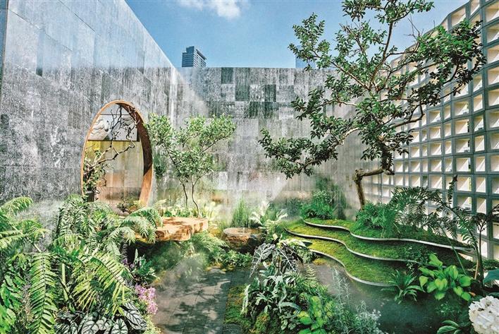 據(jù)介紹,“方寸之間”陽臺花園透過兼具閱讀室與茶室的半室內(nèi)空間的框景視窗,使視線延伸至遠(yuǎn)方;樹干的堅(jiān)韌與苔蘚的柔軟相互交融,繪成一幅生機(jī)勃勃的園景。陽臺花園中使用的電鍍石材、科技空心磚、與太陽能燈、回收瓦 片、卵石路結(jié)合,數(shù)字龍華印象與禪意空間的景觀形成強(qiáng)烈的對比,禪意與科技、當(dāng)下與未來合二為一,在方寸之間獲得無限可能。