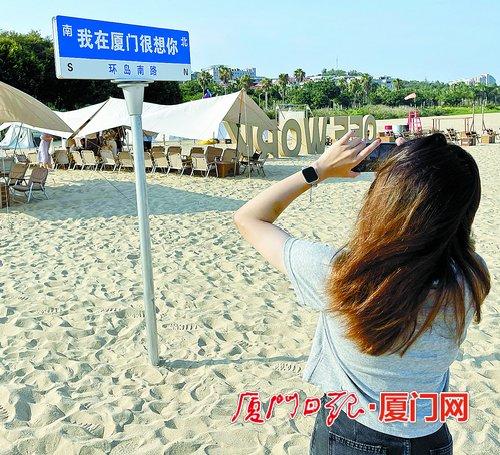近日,記者來到寶龍一城,在外圍一家奶茶店附近,一個(gè)藍(lán)白相間的路牌被放置在路中間,牌上寫著“我在廈門很想你”,上面標(biāo)注著“南、北”方向,為了確認(rèn)路牌上標(biāo)注的準(zhǔn)確性,記者打開手機(jī)的“指南針”App對(duì)照,發(fā)現(xiàn)路牌所標(biāo)注的地理位置并不準(zhǔn)確。在環(huán)島南路的椰風(fēng)寨附近一個(gè)戶外露營地,沙灘上醒目的位置也立著一塊路牌,上面的標(biāo)識(shí)與寶龍一城的基本一致,不少游客在此打卡拍照。