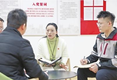 武漢順衡速運黨支部書記張麗(右二)為入黨積極分子答疑解惑。記者 胡冬冬 攝