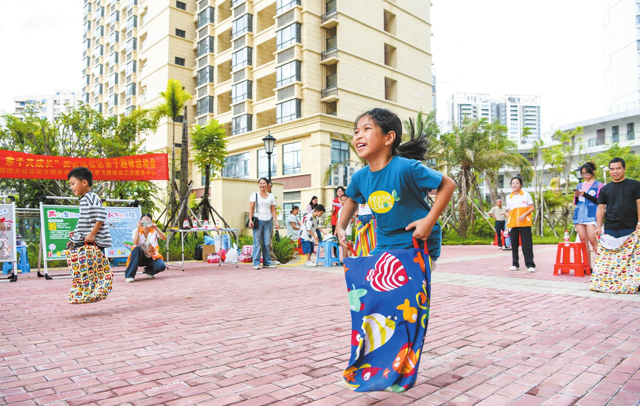9月16日,在面前坡社區(qū)組織開展的親子趣味運(yùn)動會上,小朋友正在參加“歡樂袋鼠跳”游戲。記者 康登淋 攝