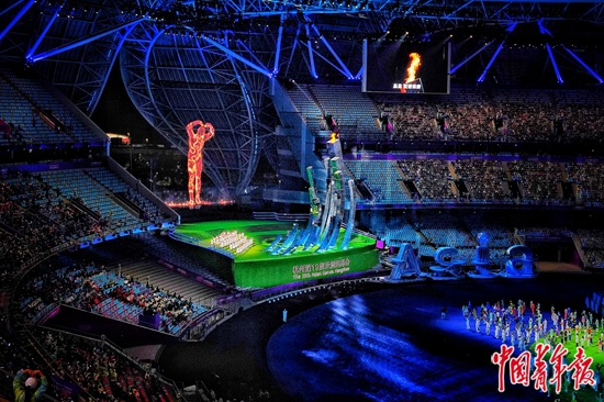 10月8日,浙江杭州市奧體中心體育場,杭州第19屆亞運(yùn)會(huì)閉幕式舉行,“數(shù)字火炬手”擺出“比心”的姿勢,見證杭州亞運(yùn)會(huì)主火炬緩緩熄滅。中青報(bào)·中青網(wǎng)記者 趙迪/攝