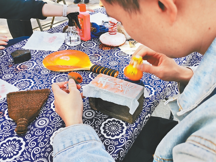 國慶期間,游客在八大處公園舉辦的活動中體驗非遺傳承技藝拓印。記者 吳鏑 攝