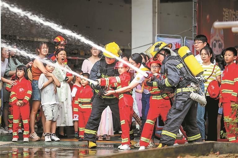 沙頭社區(qū)小朋友體驗當“消防員”。