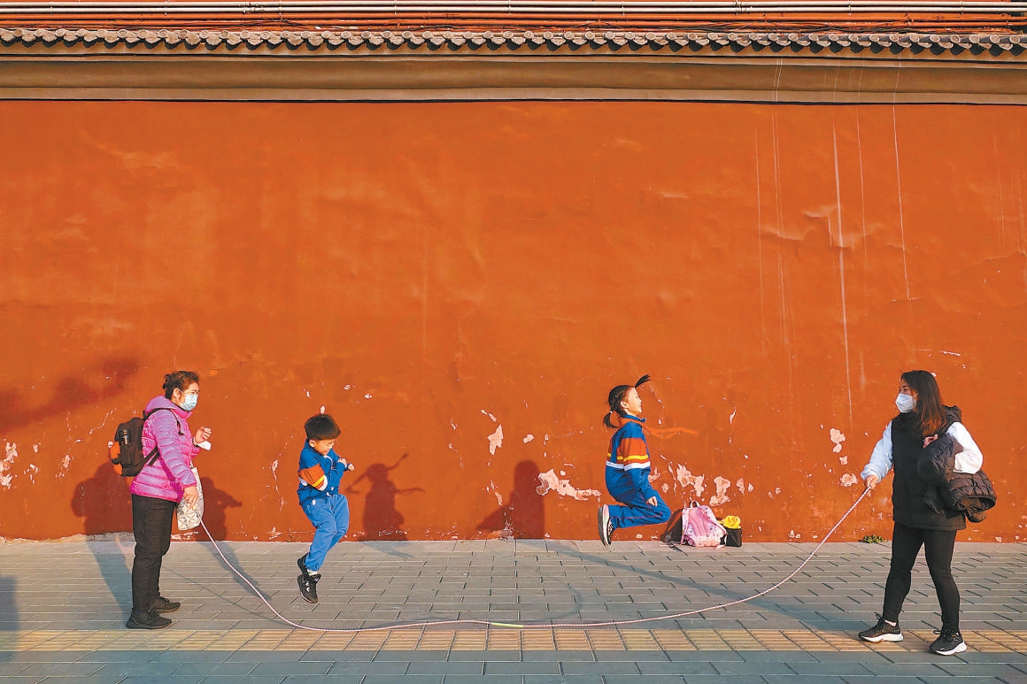 雍和宮古老的紅墻下,剛剛放學(xué)的孩子們?cè)诙张?yáng)下快樂(lè)地跳繩。 楊建國(guó)攝