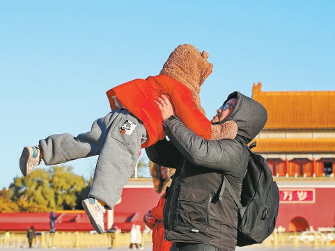 父子倆不懼寒冷,在天安門廣場(chǎng)上快樂(lè)嬉戲,享受幸福瞬間。 王新 攝