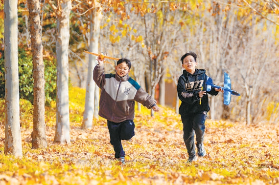 郊野山林間,兩個(gè)孩子在金黃色的落葉堆中奔跑,享受快樂(lè)童年。 金建軍 攝