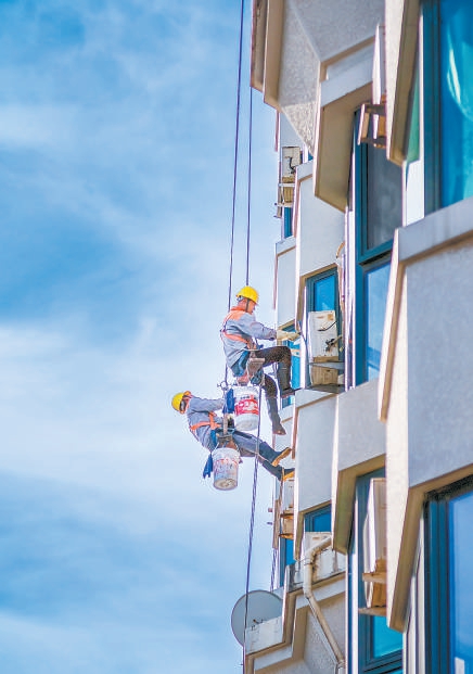 朝陽(yáng)區(qū)將臺(tái)西路芳園里,工人們正在忙著為高樓“刷身洗臉”,守護(hù)美麗家園。劉玉松 攝