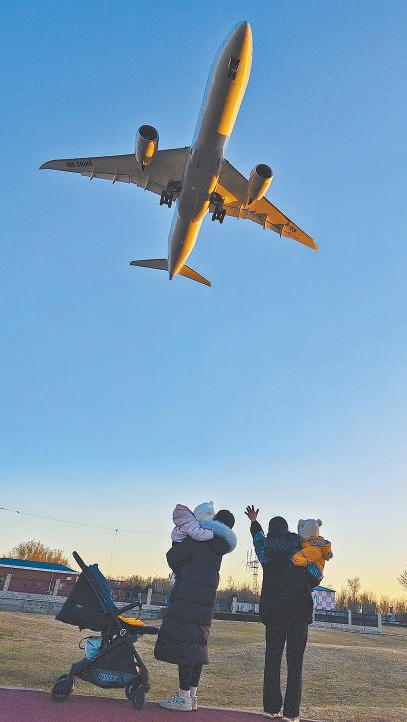 夕陽(yáng)照耀著大地,給人們帶來(lái)溫暖和希望。首都機(jī)場(chǎng),一家人正向著大飛機(jī)快樂(lè)招手。柳峰 攝