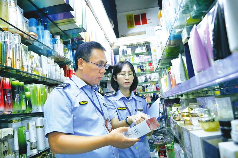 南寧市市場(chǎng)監(jiān)管局執(zhí)法人員在一家化妝品經(jīng)營(yíng)店進(jìn)行現(xiàn)場(chǎng)檢查。(何正君 攝)