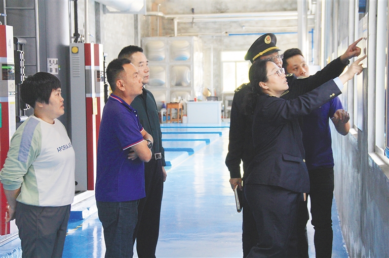 陽光照進(jìn)鍋爐房內(nèi),身穿藍(lán)色工服的工人做著日常維護(hù),瓊海市綜合行政執(zhí)法局工作人員在開展檢查。