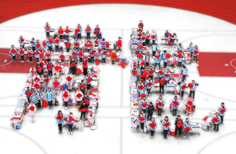 南寧市青秀區(qū)星湖學(xué)區(qū)開(kāi)展“我家春聯(lián)我書(shū)寫(xiě)”活動(dòng)。在主會(huì)場(chǎng),學(xué)生排列成繁體“龍”字等隊(duì)形,在書(shū)法家們的帶領(lǐng)下?lián)]毫潑墨,寫(xiě)下翰墨飄香的祝福。(楊春發(fā) 攝)