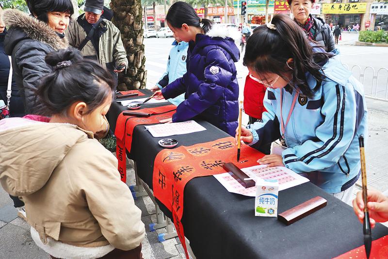 南寧市東葛路小學(xué)與東葛路社區(qū)聯(lián)合開(kāi)展黨員進(jìn)社區(qū)服務(wù)群眾志愿活動(dòng),黨員教師、學(xué)生代表紛紛執(zhí)筆,現(xiàn)場(chǎng)為社區(qū)居民書(shū)寫(xiě)春聯(lián)和“?!弊郑屔鐓^(qū)居民提前感受節(jié)日的溫暖。(晏維寧 攝)