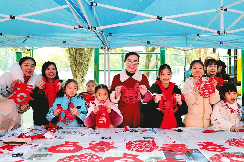 南寧市榮和實(shí)驗(yàn)學(xué)校攜手社區(qū)、物業(yè)開(kāi)展“欣欣向榮迎新年 文明實(shí)踐樹(shù)新風(fēng)”志愿服務(wù)活動(dòng),黨員教師、少先隊(duì)員代表現(xiàn)場(chǎng)揮毫潑墨書(shū)寫(xiě)春聯(lián)和“?!弊?、剪窗花,表達(dá)對(duì)新年的美好祝愿和對(duì)美好生活的向往。(嚴(yán)文娟 攝)