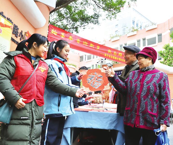 南寧市五象新區(qū)第三實(shí)驗(yàn)小學(xué)黨員教師帶領(lǐng)學(xué)生們深入周邊社區(qū),開(kāi)展“迎新春、寫(xiě)春聯(lián)、送春聯(lián)”活動(dòng),為群眾送上新春的祝福。(江虹霞 攝)