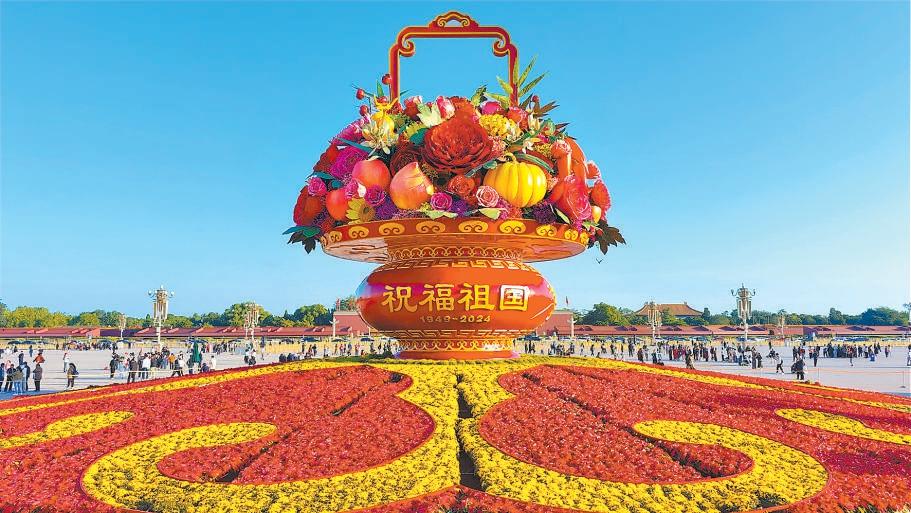 9月23日,天安門廣場(chǎng)“祝福祖國(guó)”巨型花籃已吊裝完成,廣場(chǎng)裝扮一新,東西兩側(cè)花壇里海棠花、菊花、串紅等花卉競(jìng)相開放,花團(tuán)錦簇盛裝迎接國(guó)慶75周年。特約攝影 朱昱銘