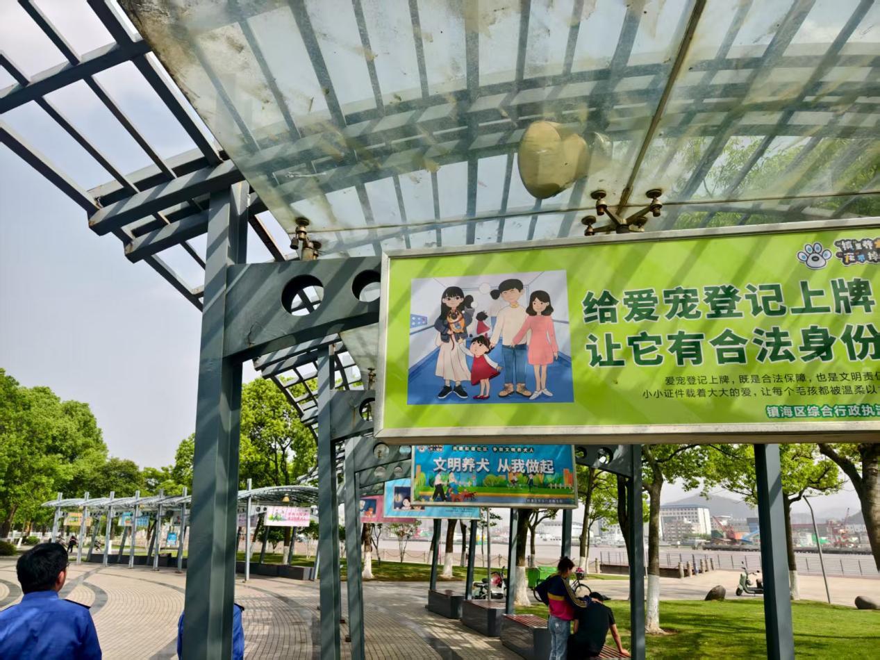 招寶山街道沿江公園的步道邊,是今年新增設(shè)的文明養(yǎng)犬宣傳長(zhǎng)廊,金屬展板上用簡(jiǎn)單的漫畫和標(biāo)語提醒市民們文明養(yǎng)犬的注意事項(xiàng)。旁邊的寵物便袋箱里面裝著一卷卷可降解清理袋,供遛狗的居民隨時(shí)取用。
