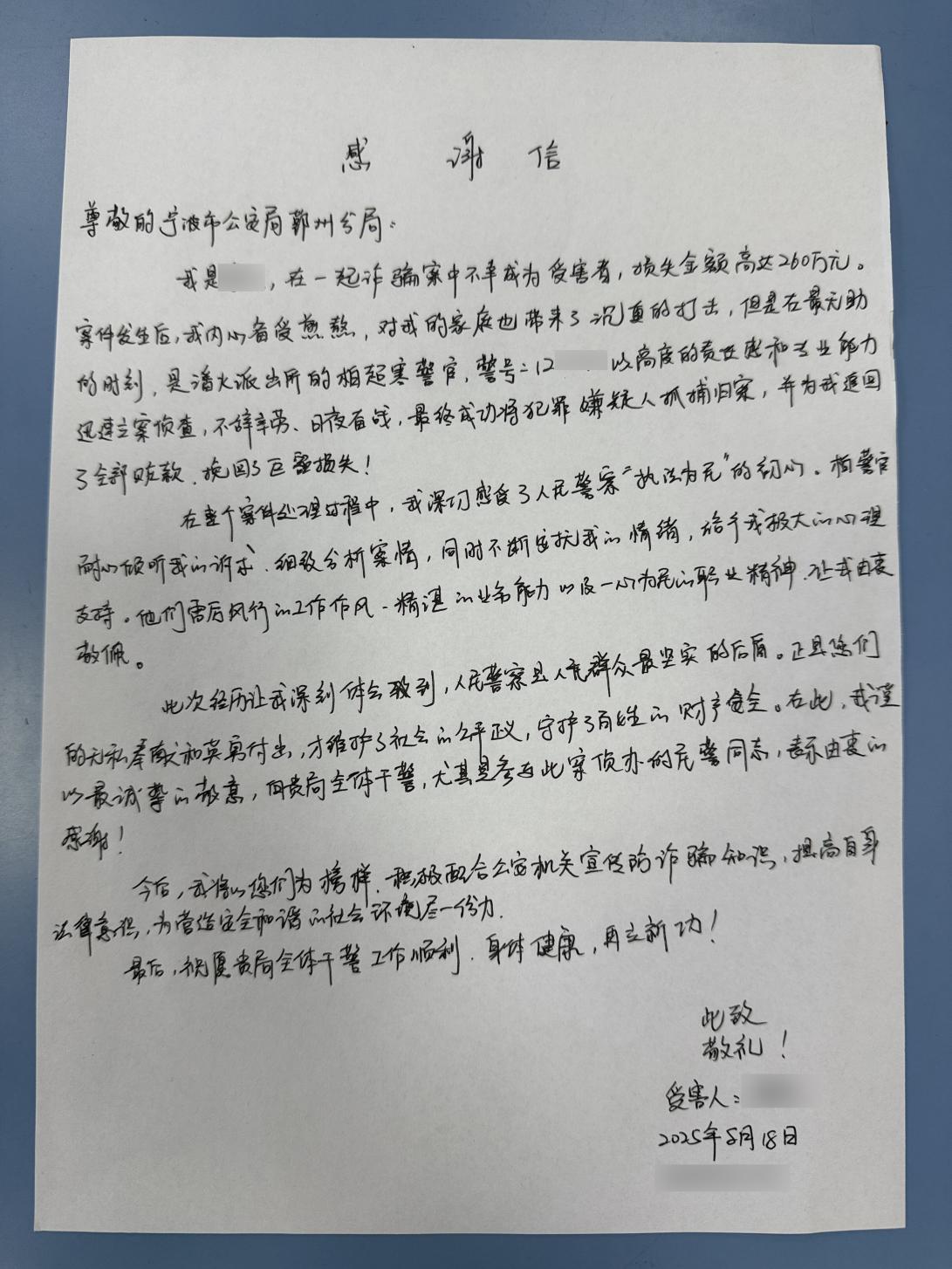 “這是我收到的最有意義、最特別的生日禮物!”8月19日,浙江省寧波市公安局鄞州分局潘火派出所副所長柏超寒,在36歲生日這天,收到了一份出人意料的“驚喜”:一封情真意切的感謝信和一面印著“神警雄風揚正義,巨額挽損暖民心”的錦旗。這份心意源自一起260萬元詐騙案件的圓滿收官。
