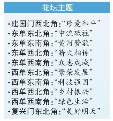 本次長安街沿線布置的立體花壇共10組,東至建國門,西到復(fù)興門,東單、西單路口各布置4組。東單路口4組花壇圍繞銘記歷史、紀(jì)念抗戰(zhàn)勝利主題;西單路口4組花壇展現(xiàn)祖國繁榮、人民幸福場景。其中,東單東北角“中流砥柱”花壇頂高最高,達(dá)10.9米。