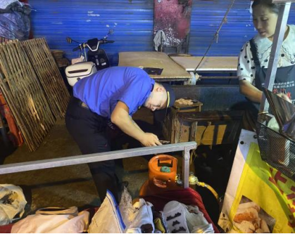 執(zhí)法人員來到港道路、中官路等夜市集中經(jīng)營(yíng)點(diǎn),建立“一攤一檔”安全臺(tái)賬,對(duì)使用燃?xì)獾纳虘暨M(jìn)行全覆蓋檢查。過程中,執(zhí)法人員重點(diǎn)對(duì)夜市區(qū)域內(nèi)液化氣瓶是否具有年檢標(biāo)識(shí)、液壓閥的老舊程度、輸氣膠管的老化程度、滅火器是否合理配備和擺放等情況進(jìn)行詳細(xì)檢查。