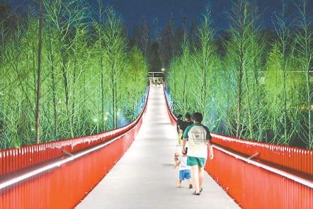 離開液店再向東,過(guò)了宋莊路,就來(lái)到了涼水河畔的霧森水廊區(qū)。從涼水河主河道引出的水系,蜿蜒在綠樹間,一艘艘透明的小船在湖面上游蕩,尤其是夜幕降臨后,燈光秀一亮,水域瞬間變成了夢(mèng)幻的童話世界。128米長(zhǎng)的聽(tīng)風(fēng)橋,從變幻著色彩的森林間穿過(guò),隨便一拍就是大片。林下市集的烤肉和咖啡的香味,則讓煙火氣十足。