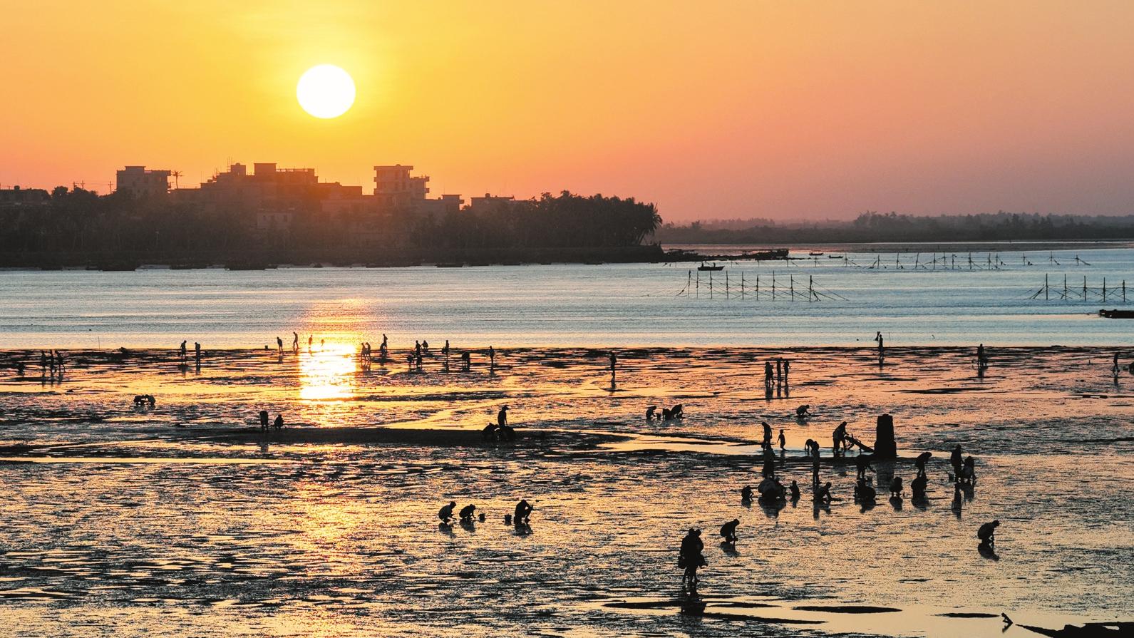 近日,在??谑忻捞m區(qū)演豐鎮(zhèn)北港島,朝陽將灘涂染成金色。一大早,不少市民游客手提小桶、腳踩灘涂、彎腰拾貝,勾勒出一幅生動(dòng)的趕海畫卷。