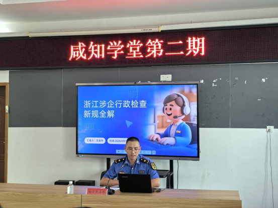 在隨后舉辦的“咸知學(xué)堂”第二期課程中,咸祥鎮(zhèn)綜合行政執(zhí)法隊(duì)二中隊(duì)中隊(duì)長(zhǎng)、公職律師王金華以《浙江涉企行政檢查新規(guī)全解》為題,結(jié)合省、市最新政策精神,為執(zhí)法人員與監(jiān)督員帶來(lái)一場(chǎng)“雙向賦能”的專題培訓(xùn)。他詳細(xì)解讀了執(zhí)法主體“四嚴(yán)禁”、執(zhí)法檢查“五個(gè)嚴(yán)禁、八個(gè)不得”等內(nèi)容,通過真實(shí)案例展示“怎樣才算規(guī)范檢查”“企業(yè)如何識(shí)別違規(guī)行為”,并現(xiàn)場(chǎng)演示掃碼檢查、數(shù)據(jù)實(shí)時(shí)上傳等數(shù)字化流程,要求執(zhí)法人員做到每一次執(zhí)法全程留痕、可追溯可評(píng)價(jià)。