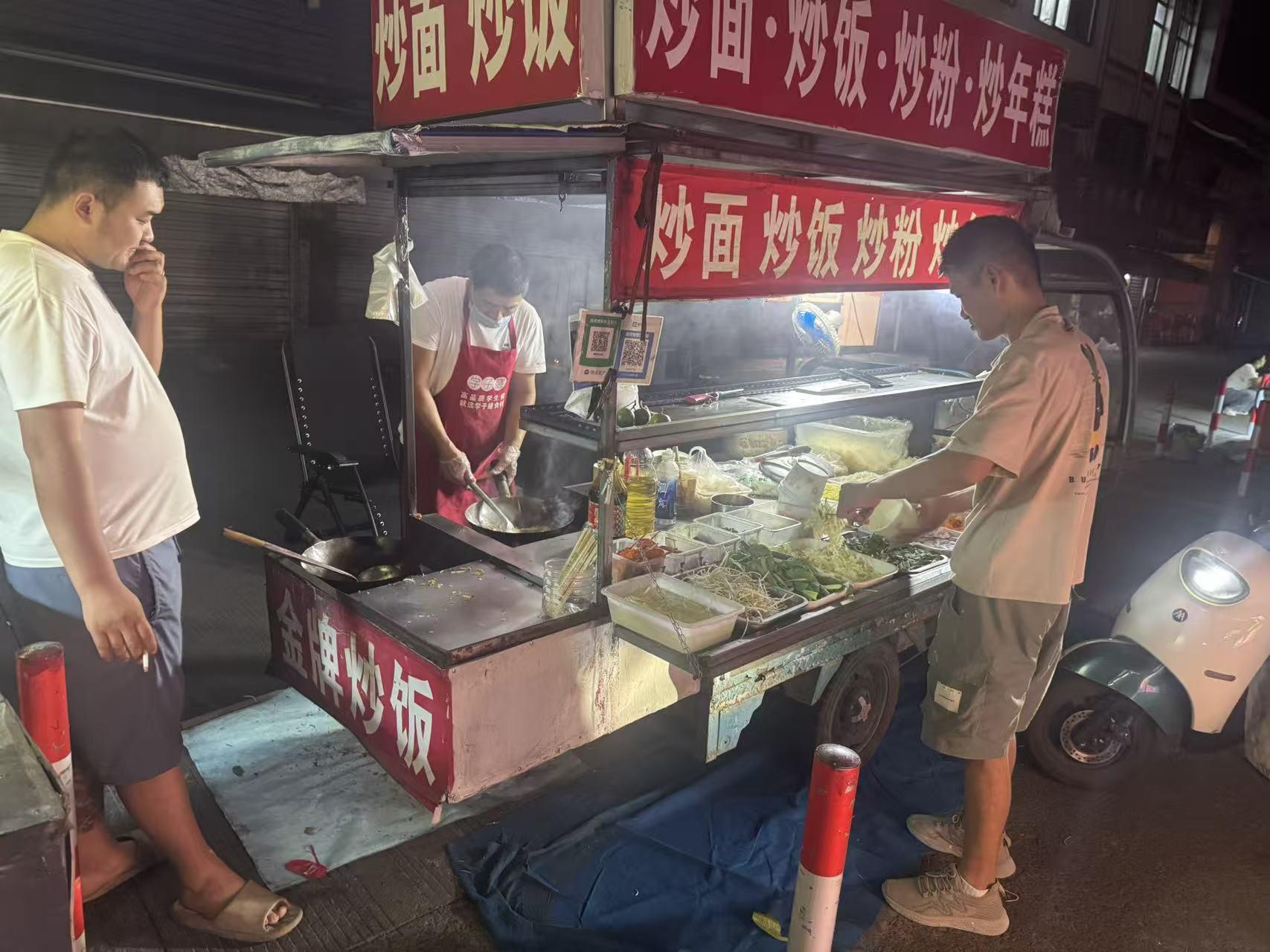 地塊的夜間閑置、城區(qū)內(nèi)居民的夜間零星用餐需求、流動(dòng)攤販生計(jì)難問(wèn)題,“堵點(diǎn)”與“出口”一拍即合,加上之前臨港產(chǎn)業(yè)園的治理經(jīng)驗(yàn),8月初,柴橋中隊(duì)依托“侖小城”普法平臺(tái),聯(lián)合公安、市監(jiān)、街道職能科室等部門(mén),對(duì)流動(dòng)設(shè)攤攤主開(kāi)展普法座談。針對(duì)部分?jǐn)傊鞯暮侠碓O(shè)攤需求,中隊(duì)跳出“一刀切”治理思維,打好“時(shí)間差”,創(chuàng)新采用“空間置換”模式盤(pán)活約500平方米的場(chǎng)地資源。