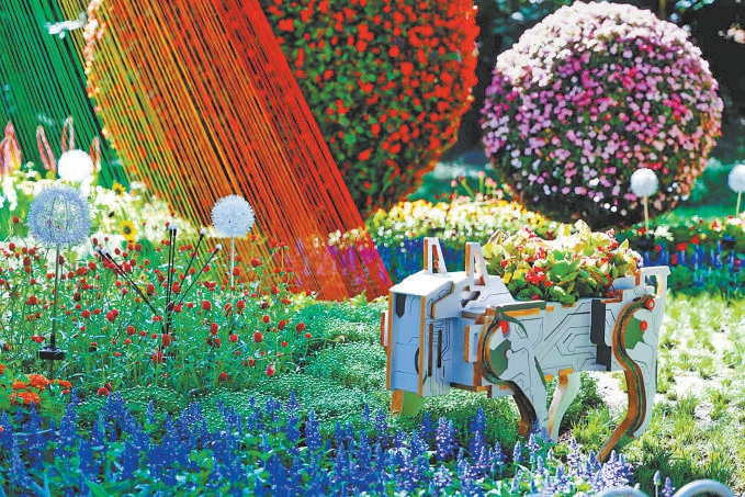 玉淵潭公園“彩色星河”花園造景中的“機器狗”花缽使用廢木料拼接。