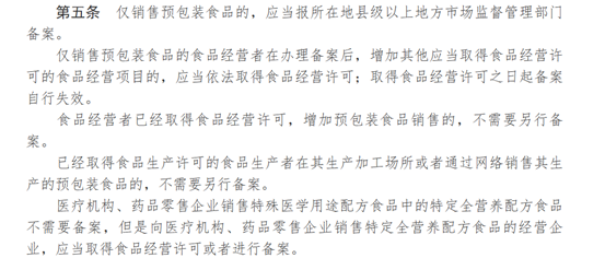 《辦法》規(guī)定,僅銷售預(yù)包裝食品,不需要取得食品經(jīng)營(yíng)許可。特殊食品屬于預(yù)包裝食品,作為經(jīng)營(yíng)戶,如果銷售包括特殊食品在內(nèi)的預(yù)包裝食品,那么需要格外關(guān)注《辦法》的第五條、第六章。作為僅銷售預(yù)包裝食品備案的專門條款和章節(jié),它們明確了備案范圍、備案主體資質(zhì)要求和備案信息公示等內(nèi)容。