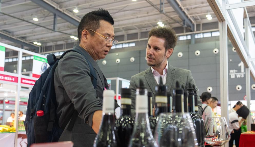 9月19日,在長(zhǎng)沙國(guó)際會(huì)展中心,參展商(右)在介紹展出的紅酒。新華社記者 陳思汗 攝