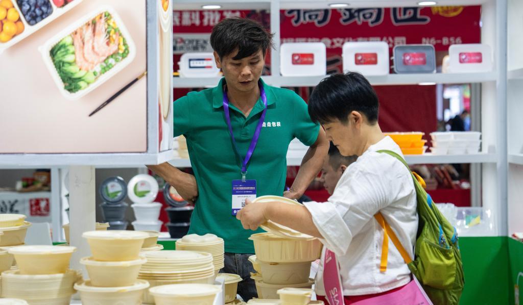 9月19日,在長(zhǎng)沙國(guó)際會(huì)展中心,觀眾(右)在了解一次性飯盒。新華社記者 陳思汗 攝