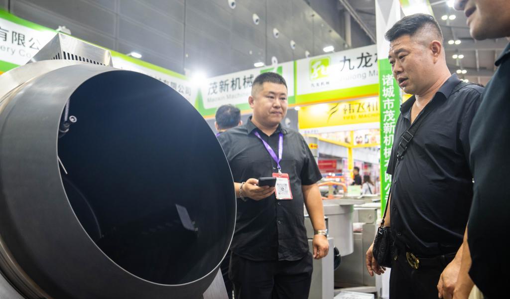 9月19日,在長(zhǎng)沙國(guó)際會(huì)展中心,觀眾(右)在了解商用炒菜設(shè)備。新華社記者 陳思汗 攝