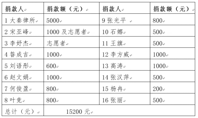 律師們?cè)诼伤爸魅侮贸杉奶?hào)召下,自發(fā)向紅十字會(huì)及需要幫助的群體主動(dòng)捐款,在律所群里踴躍接龍愛(ài)心助力,共計(jì)捐款15200元,用溫暖的愛(ài)心譜寫著律師心懷社會(huì)的動(dòng)人情懷。
