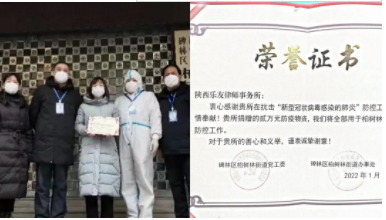 疫情發(fā)生后,陜西樂(lè)友律師事務(wù)所律師在西安市法律援助中心的安排下,堅(jiān)守12345市民熱線法律服務(wù)專席,以專業(yè)法律服務(wù)為西安抗疫奉獻(xiàn)自己的力量。1月4日,律所為支持社區(qū)疫情防控工作,通過(guò)西安市碑林區(qū)柏樹(shù)林街道辦事處,向戰(zhàn)斗在一線的社區(qū)疫情防控人員捐贈(zèng)價(jià)值兩萬(wàn)元的防控物資。