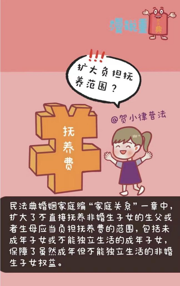 民法典婚姻家庭編“家庭關(guān)系”一章中,擴大了不直接撫養(yǎng)非婚生子女的生父或者生母應(yīng)當負擔撫養(yǎng)費的范圍,包括未成年子女或者不能獨立生活的成年子女,保障了雖成年但不能獨立生活的非婚生子女權(quán)益,比如:殘疾兒、因患病或遭遇意外等無法獨立生活的非婚生子女。