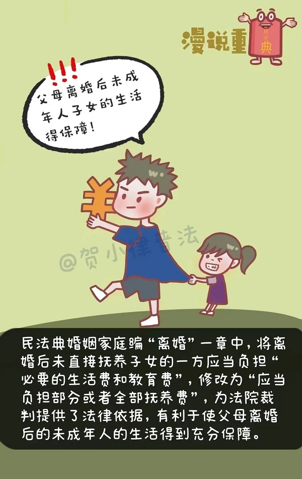民法典婚姻家庭編“離婚”一章中,將離婚后未直接撫養(yǎng)子女的一方應(yīng)當負擔“必要的生活費和教育費”,修改為“應(yīng)當負擔部分或者全部撫養(yǎng)費”,為法院裁判提供了法律依據(jù),有利于使父母離婚后的未成年人的生活得到充分保障。