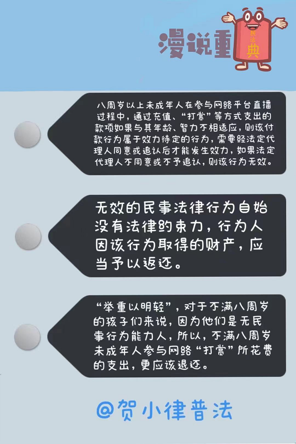 最高人民法院《關(guān)于依法妥善審理涉新冠肺炎疫情民事案件若干問題的指導(dǎo)意見(二)》明確,八周歲以上的未成年人未經(jīng)其監(jiān)護人同意,參與網(wǎng)絡(luò)付費游戲或者網(wǎng)絡(luò)直播平臺“打賞”等方式支出與其年齡、智力不相適應(yīng)的款項,監(jiān)護人請求網(wǎng)絡(luò)服務(wù)提供者返還該款項的,人民法院應(yīng)予支持。
