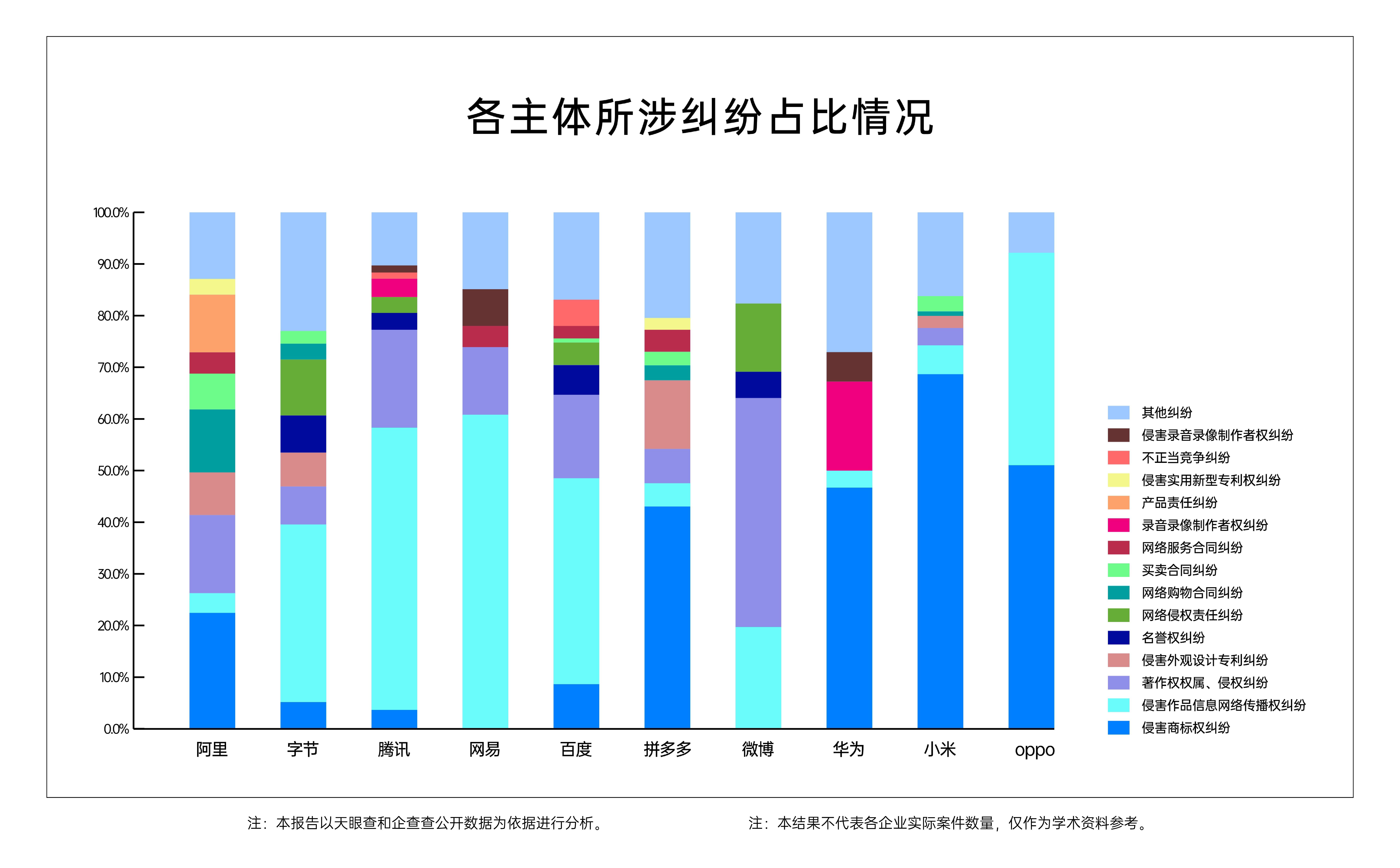 3.呈現(xiàn)高和解撤訴、中勝訴、低敗訴態(tài)勢(shì):十家企業(yè)相關(guān)民事案件勝訴率在20%~40%左右,“其他和撤訴類(lèi)別”的糾紛占比均處于較高水平,平均占比為54.54%。具體而言,微博平臺(tái)以75.64%最高;OPPO以75.04%的占比緊隨其后;拼多多與阿里的該項(xiàng)占比分別為63.48%和55.73%;騰訊、網(wǎng)易及字節(jié)三家企業(yè)依次為53.94%、52.98%和50.47%。整體呈現(xiàn),各主體勝訴率整體平均且未達(dá)高位,敗訴率普遍低位運(yùn)行,和解撤訴率則顯著提升。