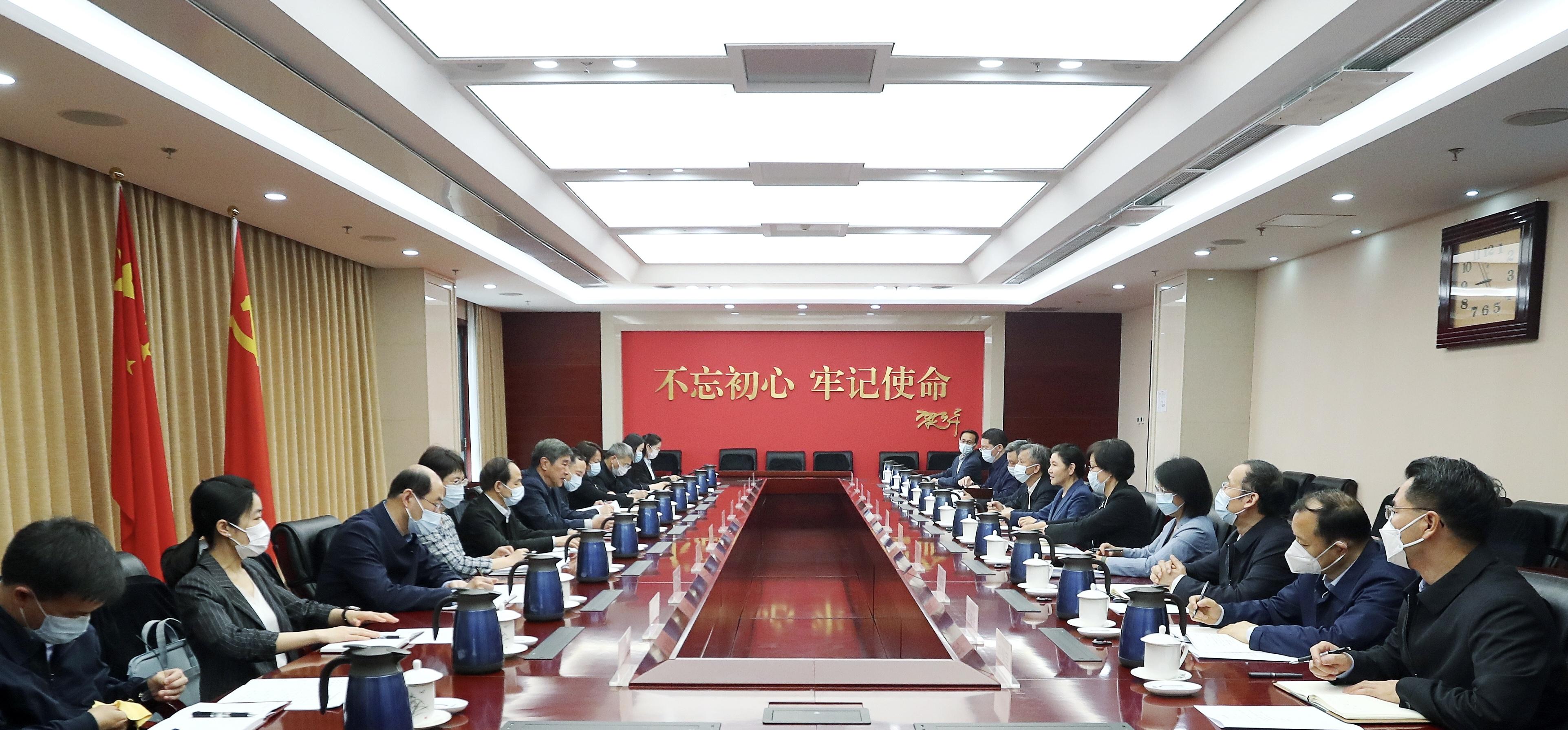 圖為4月19日上午,司法部黨組書(shū)記、部長(zhǎng)賀榮與全國(guó)人大常委會(huì)委員、全國(guó)人大監(jiān)察和司法委員會(huì)主任委員楊曉超一行座談。 攝影 李光印