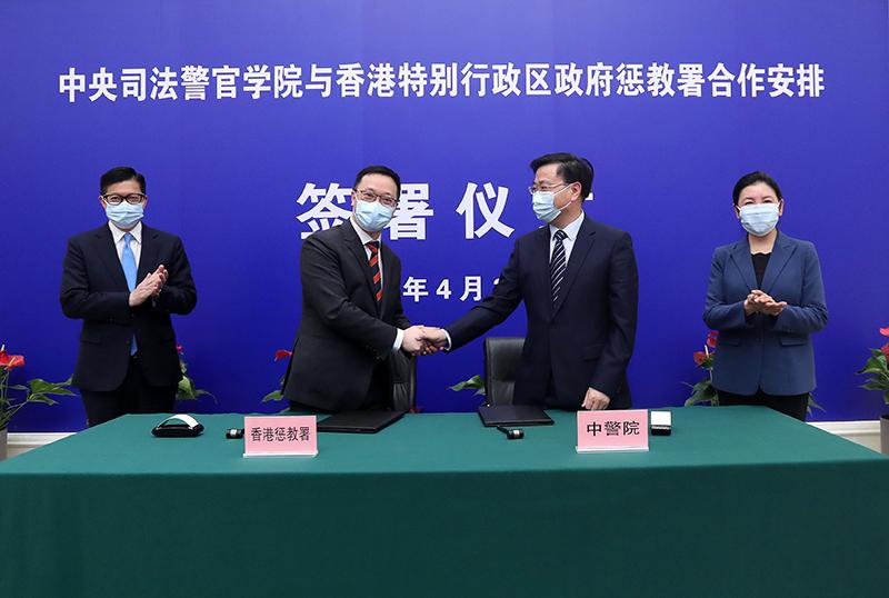 圖為4月26日,中央司法警官學院與香港特別行政區(qū)政府懲教署簽署了相關(guān)合作安排。攝影 李光印