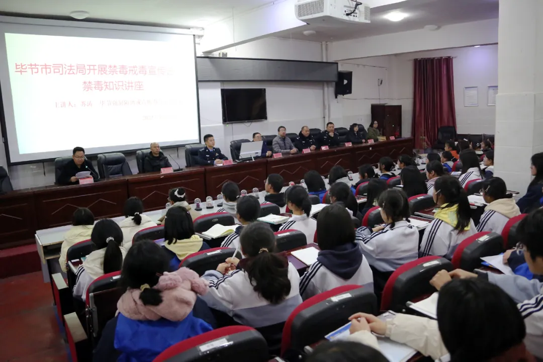 近日,貴州省畢節(jié)強制隔離戒毒所(以下稱畢節(jié)所)攜手畢節(jié)市司法局、威寧縣司法局及畢節(jié)所駐威寧縣專地融合工作站一起走進威寧縣第九中學(xué)開展以“青春無‘毒’,綠色守護”為主題禁毒宣傳活動。