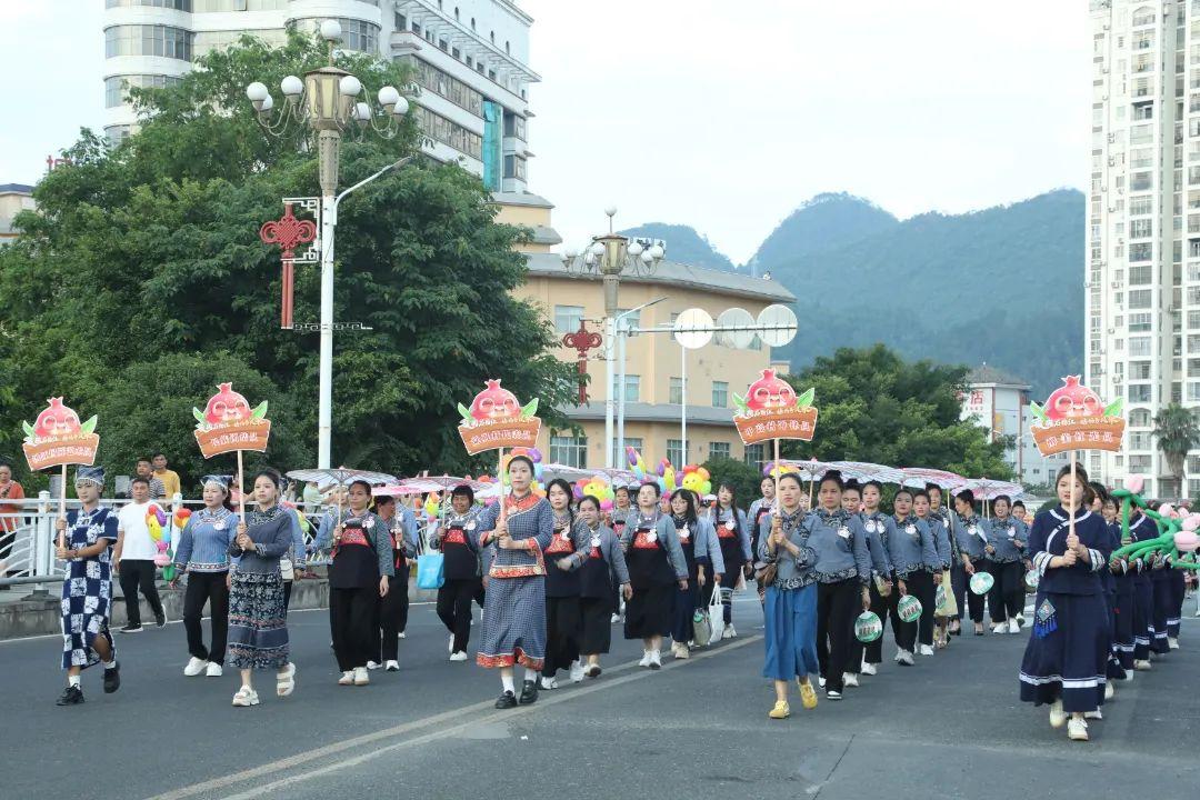 巡游長龍從荔波中央城前浩蕩出發(fā),來自各鄉(xiāng)鎮(zhèn)(街道)五十余支隊伍的“姑媽”們,從四面八方趕來相聚,組成體現(xiàn)本地特色民族文化的方陣,正整裝待發(fā)。她們身穿各式各樣的民族服飾,臉上洋溢著喜悅的笑容。