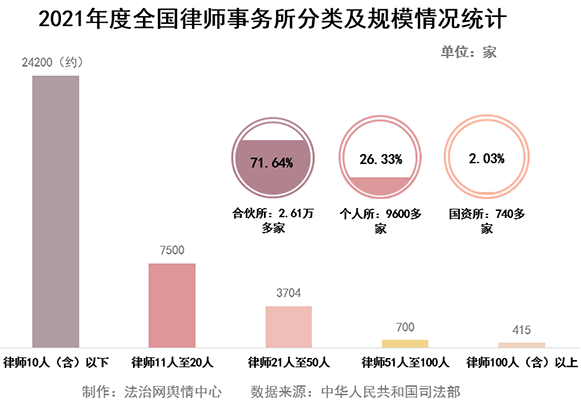 從律所規(guī)模上看,“10人及以下”律所最多,達(dá)2.42萬家,“11人至20人”律所次之,達(dá)7500家?!?00人及以上”的大型律所共有415家。
