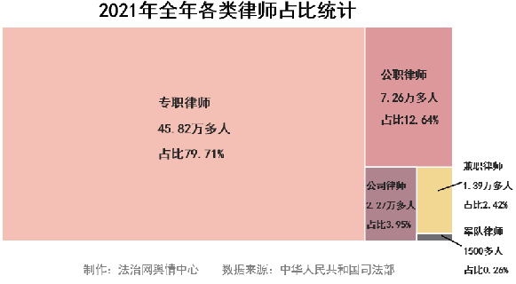 律師隊(duì)伍中,大體分為五類:專職律師、公職律師、公司律師、兼職律師、軍隊(duì)律師。截至2021年底,專職律師占比最高,達(dá)79.71%。公職律師、公司律師、兼職律師、軍隊(duì)律師分別占比12.64%、3.95%、2.42%和0.26%。