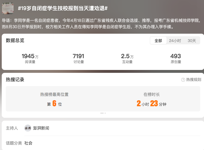 9月9日,澎湃新聞采訪相關(guān)方首發(fā)報道,當(dāng)事同學(xué)父親認(rèn)為,校方的審核、錄取程序存在諸多疏漏,直至入學(xué)報到當(dāng)天才說不予接收,讓學(xué)生錯失了報讀其他學(xué)校的機(jī)會。廣東省機(jī)械技師學(xué)院宣傳部相關(guān)負(fù)責(zé)人回應(yīng)稱,學(xué)校確實向該同學(xué)發(fā)放錄取通知書,但該殘疾人招生項目主要面向肢體殘疾和言語殘疾學(xué)生,面試時校方教師對該同學(xué)患有自閉癥并不知情。因擔(dān)心對學(xué)校正常學(xué)生造成影響,建議其找其他合適的學(xué)校就讀。該報道發(fā)布后,齊魯晚報、上游新聞、極目新聞等媒體跟進(jìn)轉(zhuǎn)載,輿情開始發(fā)酵,#19歲自閉癥學(xué)生技校報到當(dāng)天遭勸退#微博話題登上熱搜榜第6位。
