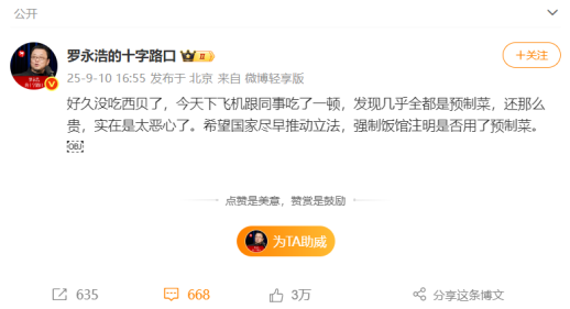 回溯這場討論的源頭,始于羅永浩的一篇微博。9月10日下午,“@羅永浩的十字路口”發(fā)博稱,“好久沒吃西貝了,今天下飛機跟同事吃了一頓發(fā)現(xiàn)幾乎全都是預制菜,還那么貴,實在是太惡心了。希望國家盡早推動立法,強制飯館注明是否用了預制菜?!碧陌l(fā)出后迅速引起網(wǎng)民關注。
